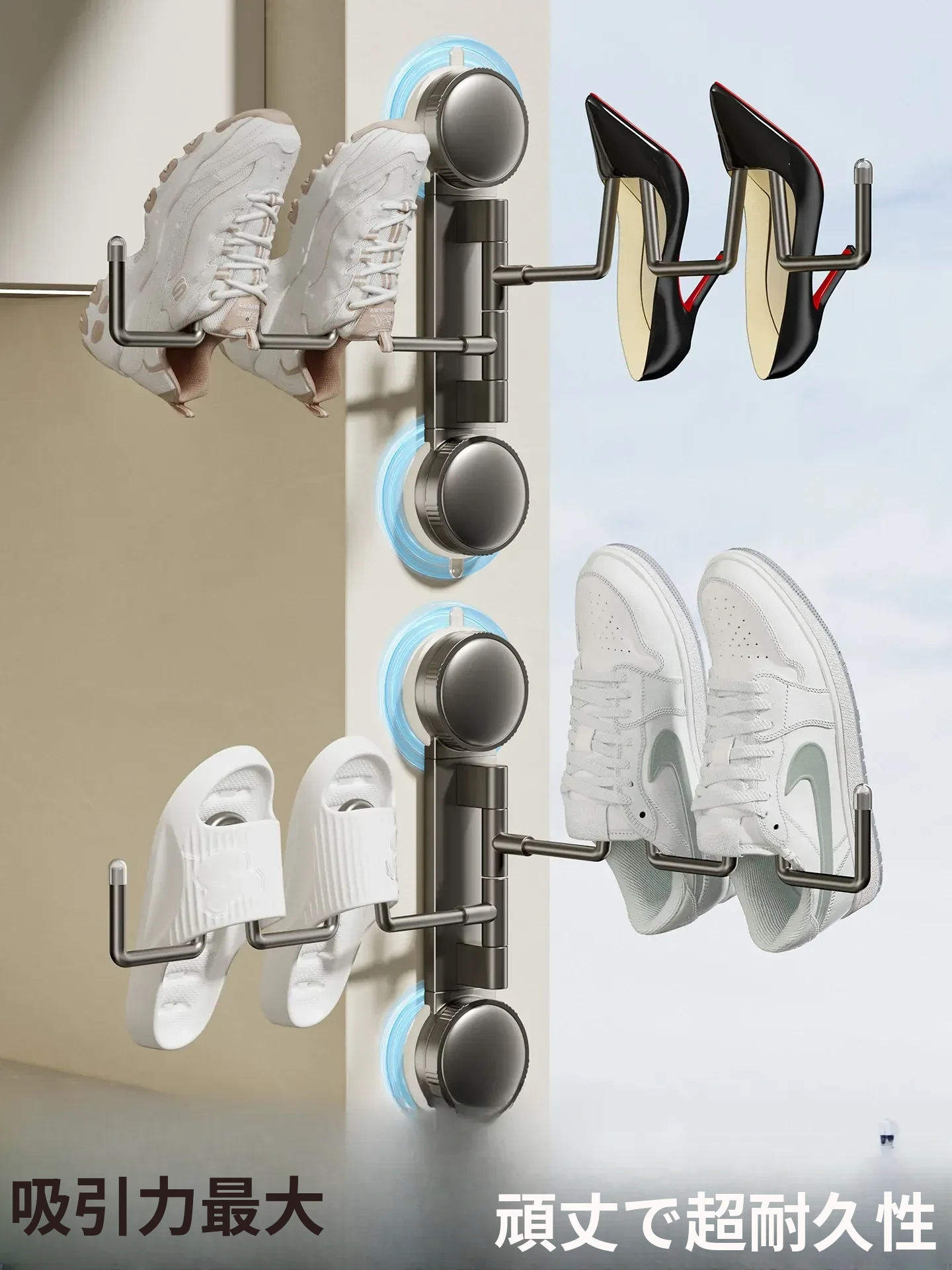 バルコニー用吸盤靴干しラック - 折りたたみ式収納架!穴を開けずに簡単取り付け、室内外で大活躍する便利アイテム!衣類や靴をスマートに乾かして、スペースを有効活用しましょう!